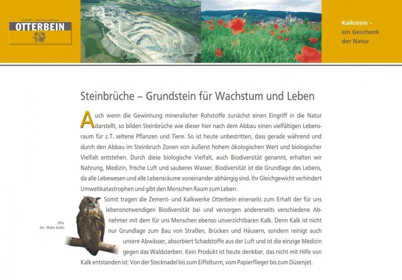 Für unsere Besuchergruppen, wie z. B. Kunden, Schulklassen, Vereine usw., haben wir im Steinbruch eine Aussichtsplattform errichtet. Neben einem tollen Ausblick über unseren Steinbruch hat man dort auch die Möglichkeit sich an Thementafeln über den Abbau von Kalk und dessen Nutzen zu informieren.