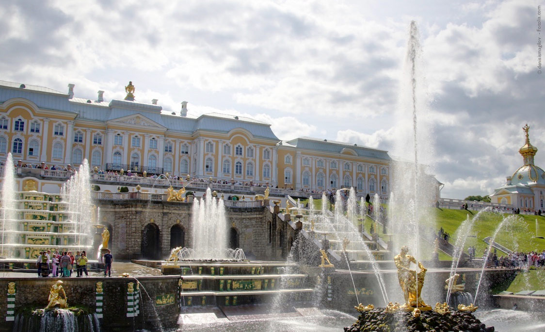 Schloss Peterhof ist eine russische Palastanlage, 30 Kilometer westlich von Sankt Petersburg. Schloss Peterhof wurde von Peter I. errichtet und von seinen Nachfolgern ausgebaut. Es gilt als „russisches Versailles“ und ist seit 1990 Weltkulturerbe der UNESCO.1